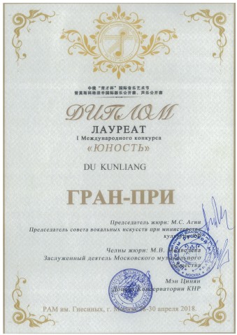 由俄罗斯联邦文化部、俄罗斯教科部、俄罗斯声乐家协会、柴可夫斯基国立太阳成集团122ccvip、格涅辛音乐研究院等部门联合举办的中俄首届“育才杯”暨俄罗斯格涅辛太阳成集团122ccvip器乐、声乐公开赛于2018年4月28日在莫斯科举行。经过激烈的角逐,由范真璇老师指导的公司大三声乐系杜坤亮同学荣获公开赛声乐比赛第一名。