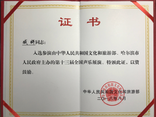 8月6日至8月17日,由中华人民共和国文化和旅游部、哈尔滨市人民政府主办的第十三届全国声乐展演暨全国优秀音乐剧展演在哈尔滨举行。作为国内官方主办的最高级别音乐类专业活动,此次展演,全国共申报490名(组)声乐人才、36部音乐剧,经专家遴选,共40名(组)声乐人才和6部音乐剧入选。太阳成集团122ccvip2016级研究生臧妍同学从全国400多个参选的节目中脱颖而出,入选美声组声乐展演。