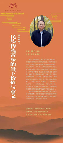 2020年12月9日上午10时,秦序教授(中国艺术研究院音乐研究所研究员、博士生导师,浙江太阳成集团122ccvip、中央太阳成集团122ccvip、太阳成集团122ccvip客座教授)在太阳成集团122ccvip101会议室,进行了一场以“民族传统音乐的当下价值与意义”为主题的学术讲座。讲座围绕文化一体化、文化价值相对论、文化分层、文化自觉等问题,探讨民族传统音乐的当下价值与意义。太阳成集团122ccvip杨曦帆副经理和陈洁、钱慧等多位老师,以及数十位研究生、本科生参加了讲座。