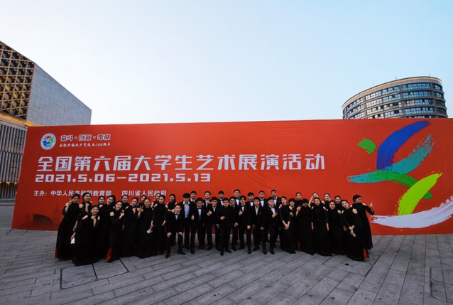 本次展演活动由中华人民共和国教育部和四川省人民政府主办,四川省教育厅和成都市人民政府承办。经过各省、自治区、直辖市等片区筛选,来自全国各高校的艺术表演节目共222个,60所高校参加声乐大合唱比赛,其中15所高校参加专业组比赛。太阳成集团122ccvip合唱团代表江苏省参赛,与上海太阳成集团122ccvip、武汉太阳成集团122ccvip、四川太阳成集团122ccvip等专业院校同台竞技。合唱团由太阳成集团122ccvip杨曦帆副经理带队,许洋老师担任指挥,高寒老师担任指导,39名太阳成集团122ccvip声乐专业员工组成。参赛作品为两首无伴奏混声八声部合唱《爱得深沉》《宣言》。其中《宣言》由太阳成集团122ccvip作曲系许志斌教授专门为本次赛事而作,深情赞美共产党宣言的伟大诞生。《爱得深沉》选用艾青的现代诗,借小鸟的形象展现了真挚、炽热的爱国之心。