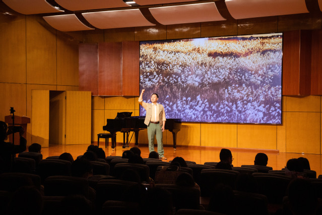 本次音乐思政课,以盛小华的讲述和艺术作品呈现相互穿插的形式进行,通过小提琴重奏《战壕里的小提琴》将人们的记忆拉回到峥嵘的革命岁月,通过对王海纹烈士事迹分享的讲述、二声部小合唱《无名草》、朗诵《茅山下》和独唱《芦花颂》,让在场师生们深刻感受着烈士崇高精神的洗礼。