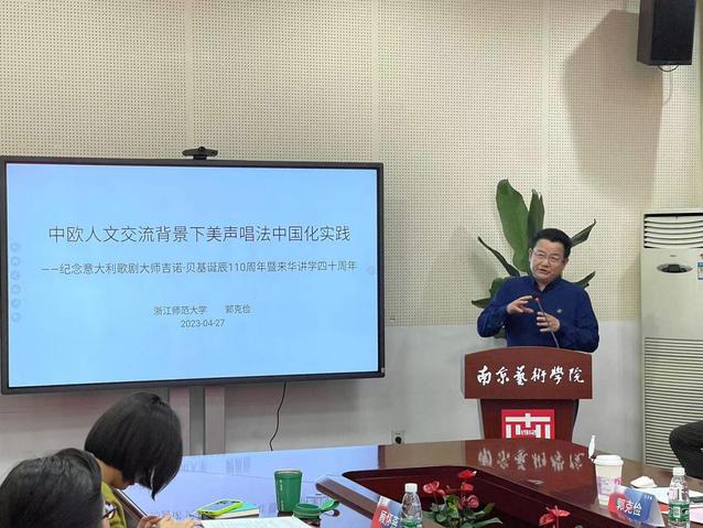 浙江师范大学施光南音乐文化研究院经理、博士生导师郭克俭教授作题为《中欧人文交流背景下美声唱法中国化实践》的报告。他以意大利歌唱家基诺·贝基20世纪在中国的讲学和排演活动为例,结合丰富一手鲜见史料和图片资料,考察了美声唱法中国化的历史变迁。他指出基诺·贝基来华经历使中国全面了解意大利美声的真谛,端正了观念,带来了美声唱法的方法,同时为中国培养了美声唱法人才。中欧的美声唱法交流,对中国声乐走向世界起到促进作用。