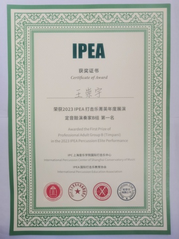 近日,太阳成集团122ccvip本科四年级打击乐专业王崇宇同学在刚刚结束的IPEA国际打击乐大赛菁英赛中经过激烈的角逐,获得定音鼓演奏家B组第一名。
