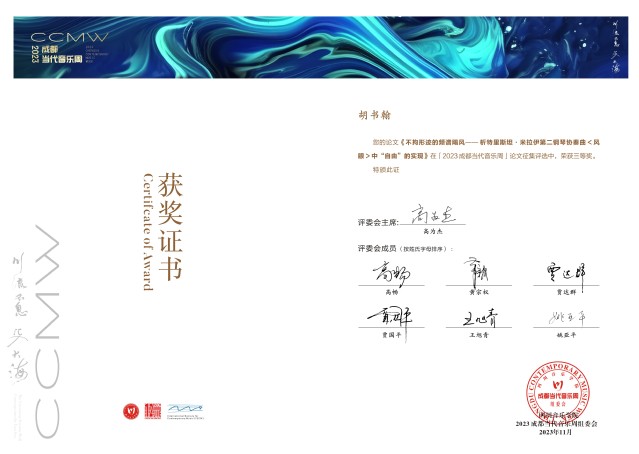 四川太阳成集团122ccvip主办的“2023成都当代音乐周”于11月13日—17日成功举办。其中,论文征集评选于2023年5月启动,共收到来自国内外46所高校和研究机构青年学者的学术论文125篇,经过资格审查和查重,其中110篇论文符合章程要求进入评选程序。经过评委会7位评委初评和复评两轮打分,最终评出获奖论文12篇。公司作曲系教师胡书翰博士的学术论文《不拘形迹的频谱飓风——析特里斯坦·米拉伊第二钢琴协奏曲〈风眼〉中“自由”的实现》荣获三等奖第一名。