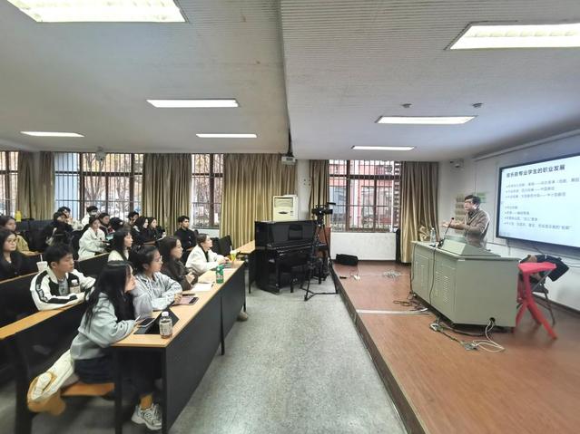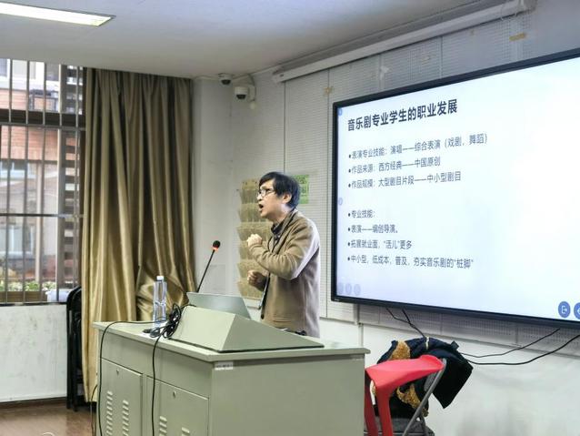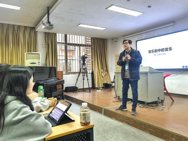 而后,陶辛教授由面到点、从宏观到微观,展开了他精彩的学术讲座。他强调音乐剧专业员工职业发展规划的重要性,阐述作为音乐剧从业者应当具备的专业技能以及未来就业方向,结合众多经典音乐剧案例,从角色、情境、行动、结构、风格等维度,梳理音乐剧中的音乐的特殊性,陶教授声情并茂的讲解让现场的师生们更加深入地理解了音乐剧的艺术语言特征。