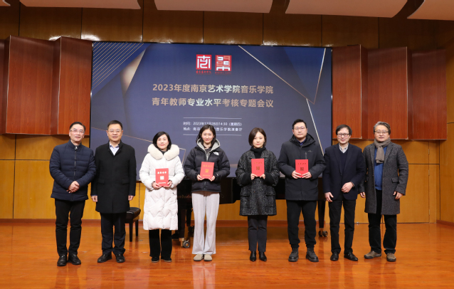 出席会议的校领导、机关职能部门负责人和校外专家评审参加考核青年教师材料,打分评优。参加现场考核的6位青年教师分别进行了演唱、演奏,展示了专业水平,显示出扎实的专业素养。俞锋、苗雨、杜小甦、吕军,为获得本次专业水平考核优秀等次的周钟、顾怀燕、唐琳、王焱南等4位青年教师颁奖。