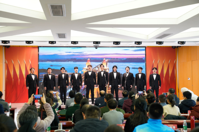 音乐公司员工带来的男声合唱《我为祖国守大桥》,用豪迈的歌声拉开了活动序幕。这首脍炙人口的经典歌曲抒发了大桥卫士内心的自豪,歌颂了守桥部队忠于职守、服务祖国和人民的崇高精神。在排练过程中,谢琨老师通过讲解歌曲的背景和意义,指导同学们不断加强表现力和感染力。现场演出中,同学们将列车通过南京长江大桥的喜庆氛围表现得惟妙惟肖,把守桥战士“头顶蓝天,脚踏江涛,胸怀朝阳,心系大桥”的豪情壮志完美呈现了出来,精彩演绎赢得了现场观众的热烈掌声。