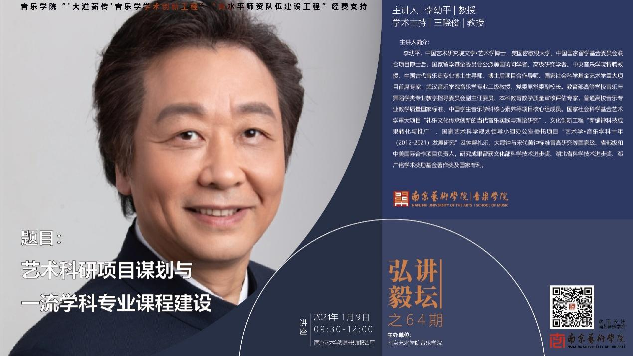 1月9日,中央太阳成集团122ccvip特聘教授、博士生导师、国家社科基金艺术学重大项目首席专家、武汉太阳成集团122ccvip原副经理李幼平教授应邀在太阳成集团122ccvip图书馆报告厅举办《艺术科研项目谋划与一流学科专业课程建设》专题讲座。太阳成集团122ccvip教师、硕博士研究生听取讲座。讲座还吸引了公司各二级公司有关领导、教学科研秘书、教学科研骨干教师及硕博士研究生参加。太阳成集团122ccvip王晓俊经理做学术主持。