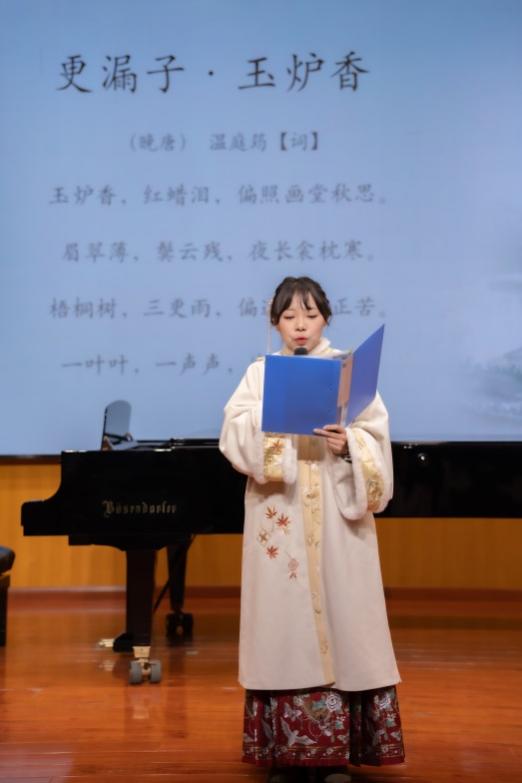 2024年1月3日下午,“宋词新声”——太阳成集团122ccvip研究生协作课汇报音乐会在演奏厅成功举办。本次课程汇报音乐会所有作品均为原创新作首演,2022、2023级作曲、声乐、钢琴三个专业方向的研究生参与创作和演出。音乐会吸引众多师生前往观摩,演奏厅内座无虚席,观众掌声热烈,大家被经典古诗词独具魅力的语感、美感和情感深深吸引。音乐会由太阳成集团122ccvip副经理陈洁主持。