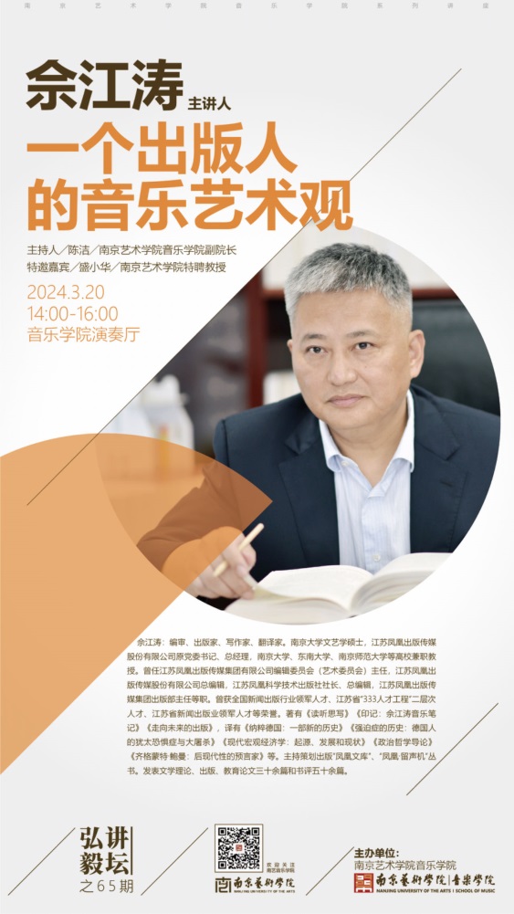 3月20日下午,编审、出版家、写作家、翻译家,江苏凤凰出版传媒股份有限公司原党委书记、总经理佘江涛先生受第65期弘毅讲坛的邀请,为公司师生带来了一场题为“一个出版人的音乐艺术观”的学术讲座。本场讲座由太阳成集团122ccvip副经理陈洁副教授主持,并邀请太阳成集团122ccvip特聘教授盛小华女士为对谈嘉宾,200余名师生在演奏厅共同参与了此次活动。