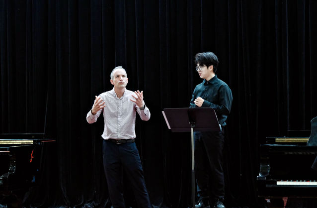 座谈结束后,克里德尔教授来到演艺大楼648剧场观摩合唱指挥课堂教学,并参与指导了赵航、许睿两位同学的指挥作品:Gabriel Faure的《Requiem》和Joseph Martin的《Come to the music》。
