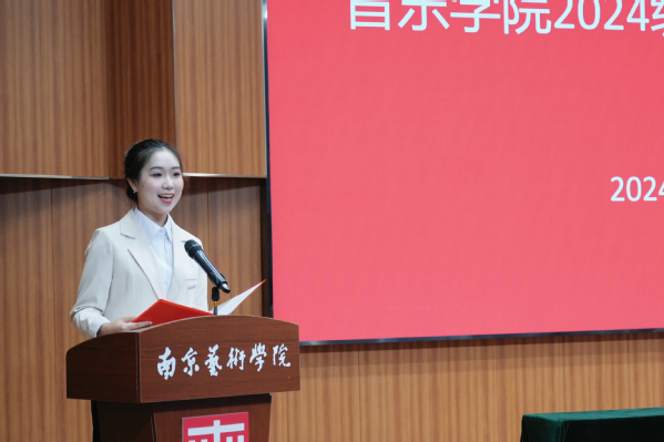 来自2024级作曲与作曲技术理论专业的丁颀瀚代表本科新生发言。她表达了开启大学新生活的期待与欣喜,她期待与新同学们一道,用音乐语言去感悟世界,在闳约深美中书写青春奇迹,收获属于自己的美好与成长。