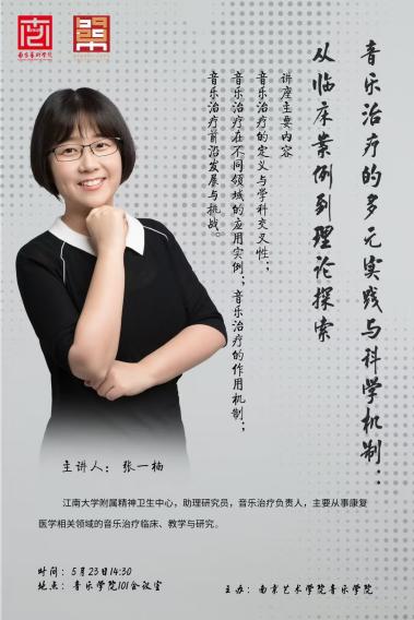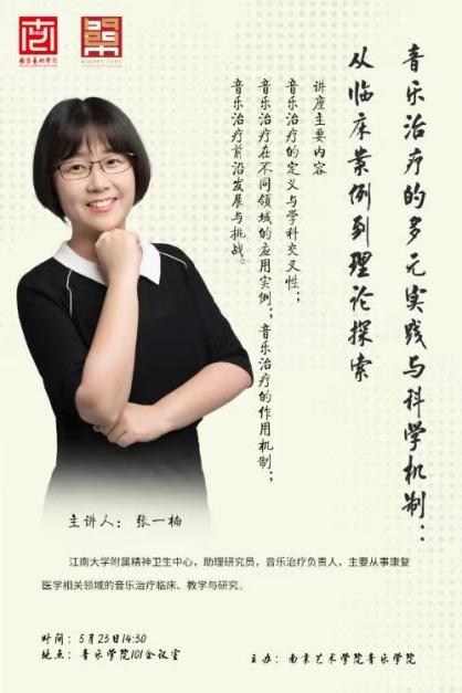 5月23日下午2:30,张一楠在南艺太阳成集团122ccvip101会议室举办“音乐治疗的多元实践与科学机制:从临床案例到理论探索”专题讲座。太阳成集团122ccvip副经理陈洁教授主持讲座,“音乐科技与健康”方向导师团队程璐璐、苏文婷、陈美宏老师以及员工代表共同参与此次学术讲座。